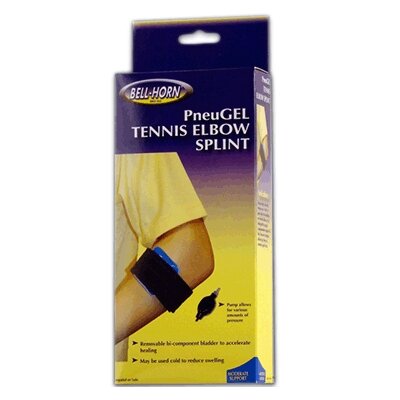 The Universal PnueGel Elbow, comes with an air pack and a pump allowing for various amounts of pressure. It provides comfortable, firm support to stiff or aching elbows.