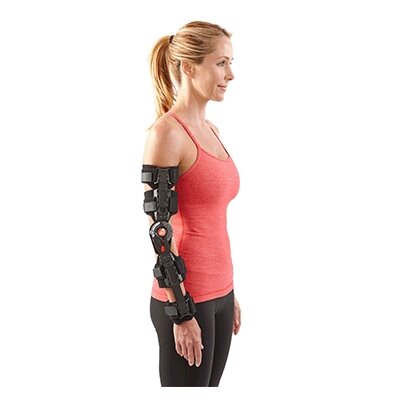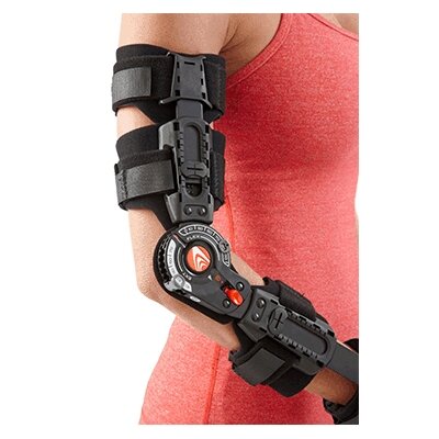 The T-Scope Elbow is ideal for fixed or controlled range of motion. This lightweight, low profile product provides telescoping forearm and humeral bars, range of motion control and lock out ability at any angle. Weighs just 13 oz. ROM control in 10° increments: extension control from -10° to 110°, flexion control from 10° to 120°.