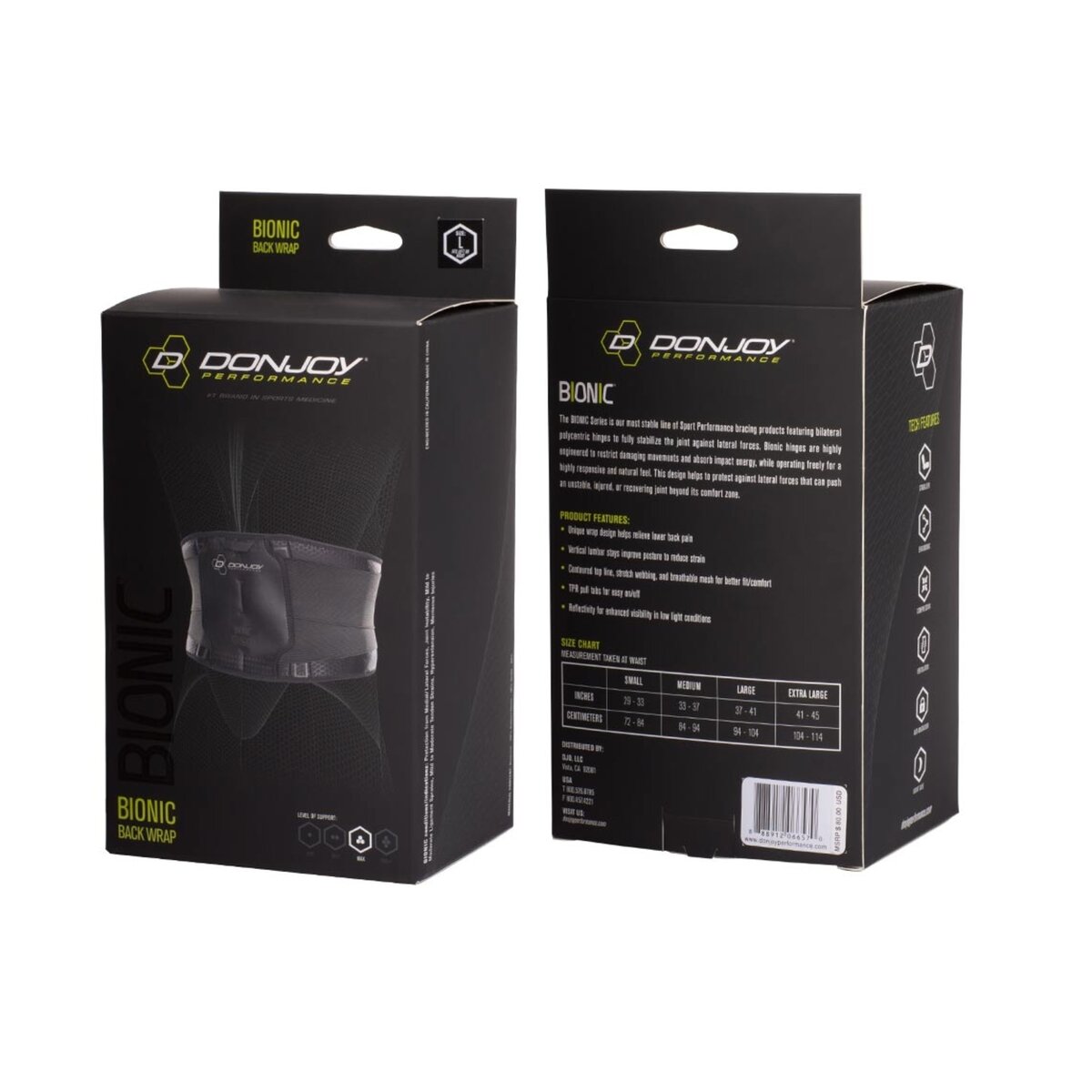 The DonJoy Performance Bionic Back Support Wrap is created with four durable upright stays to help protect against strains and pulls. Its contoured top and bottom edges ensure a comfortable fit for all body types while providing the necessary level of support. Made with breathable, ventilated material, the wrap promotes steady airflow, and the stretch webbing allows for adjustable, graduated compression around the torso.