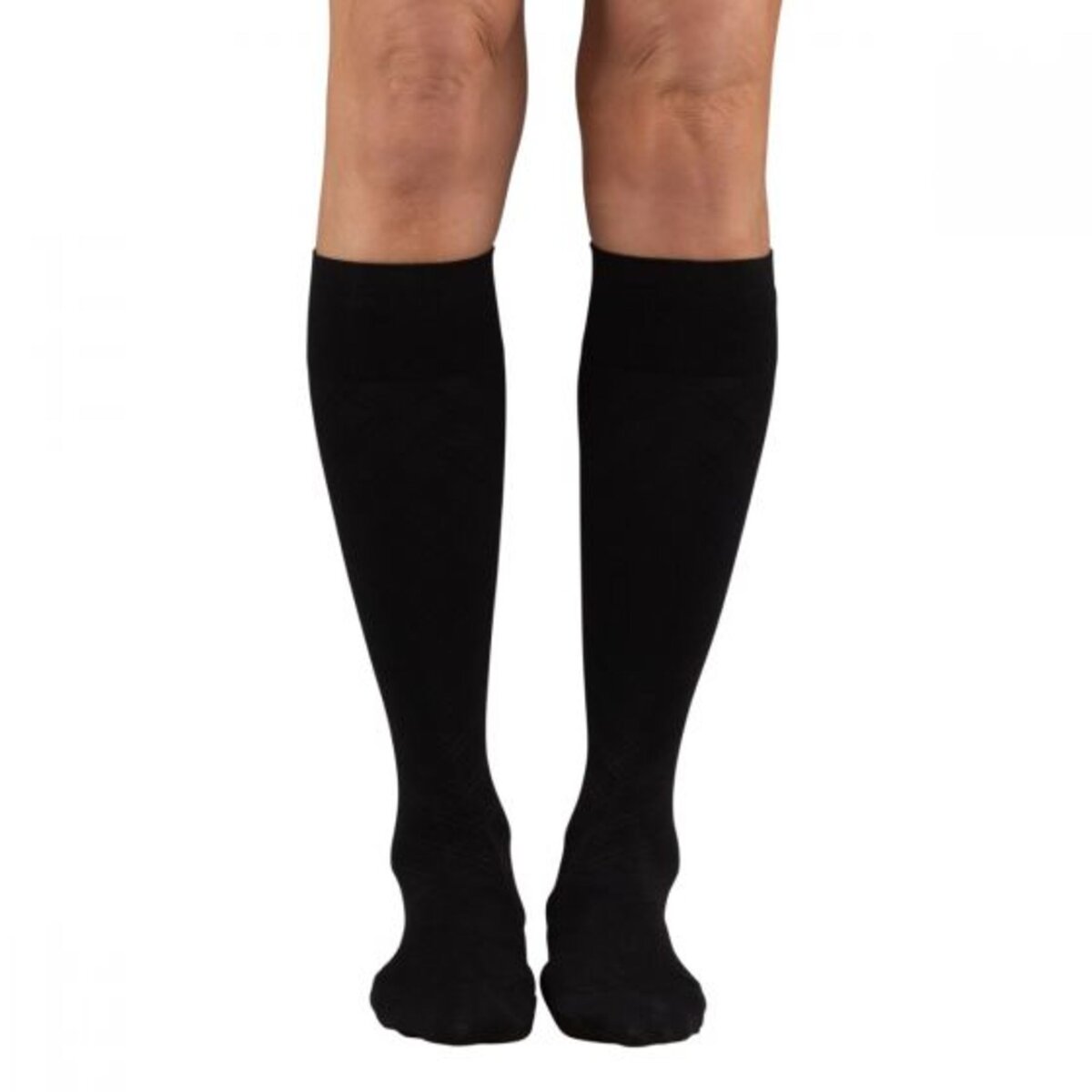 A classic look meets a functional stocking. Combining fashion and medical function, the Dr. Comfort® Everyday Style Double Cross is a mid-weight opaque compression stocking that can be dressed up or down depending on your attire. The Double Cross support sock provides 15-20 mmHg compression and can help relieve symptoms of varicose and spider veins as well as help reduce swelling in the legs, feet, and ankles. Featuring solid black textured lines crisscrossing down, the Double Cross unisex design delivers fashionable support and comfort for just about any occasion.