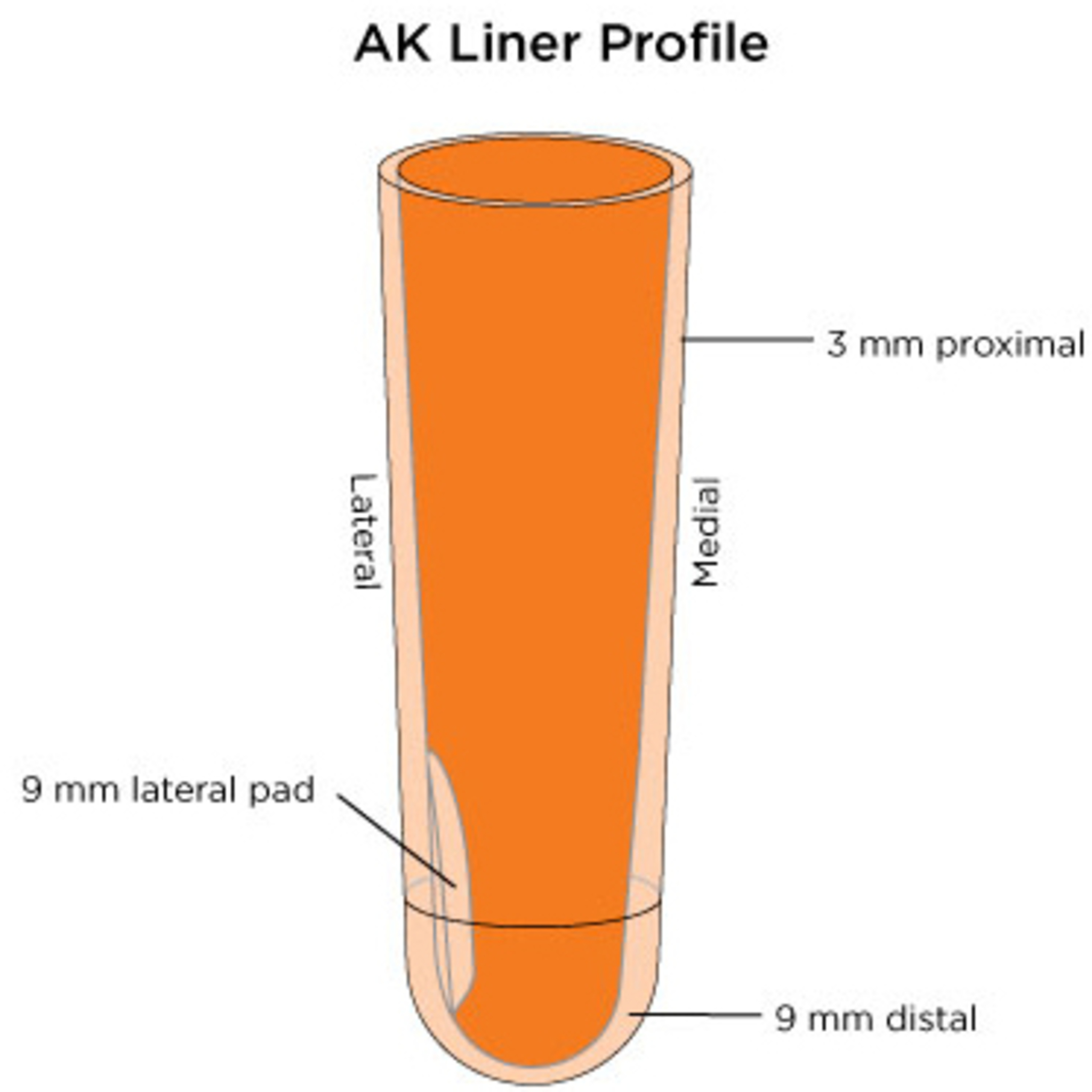 The Express AK Liner features a softer-durometer silicone that replicates the feel and comfort of Thermoplastic Elastomer (TPE) gel liners. The platinum-cured, medical-grade silicone contains skin-friendly Vitamin E to foster a healthy limb environment. No messy lotions or creams are necessary to don the liner. The Express AK Locking Liner features a standard distal umbrella, while, the cushion liner is compatible with elevated vacuum when using Select fabric.1