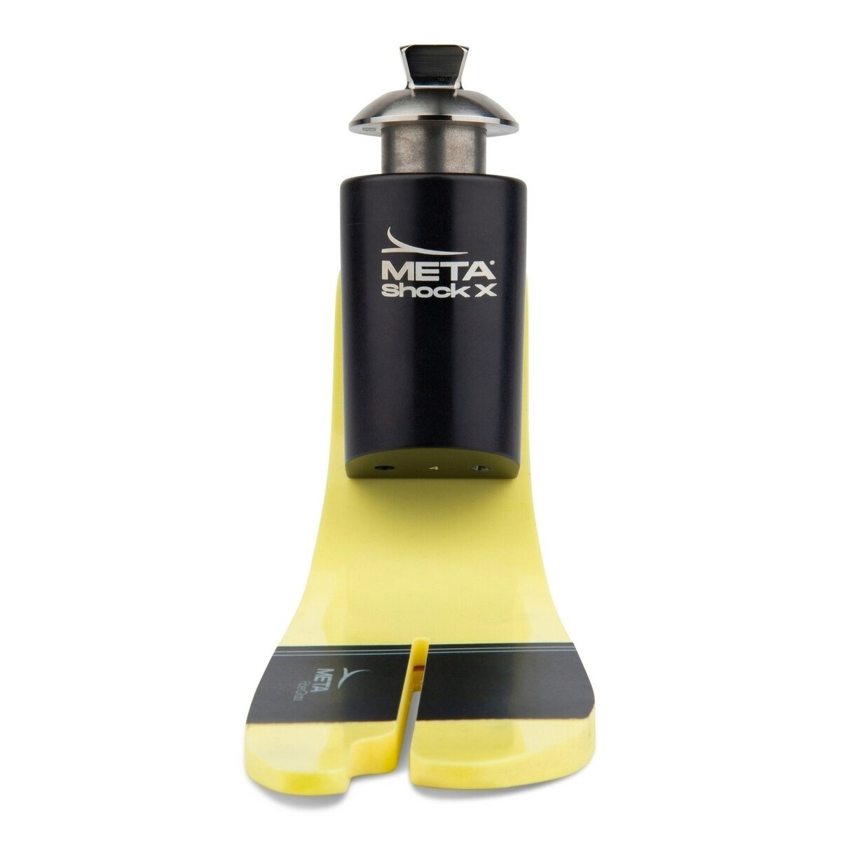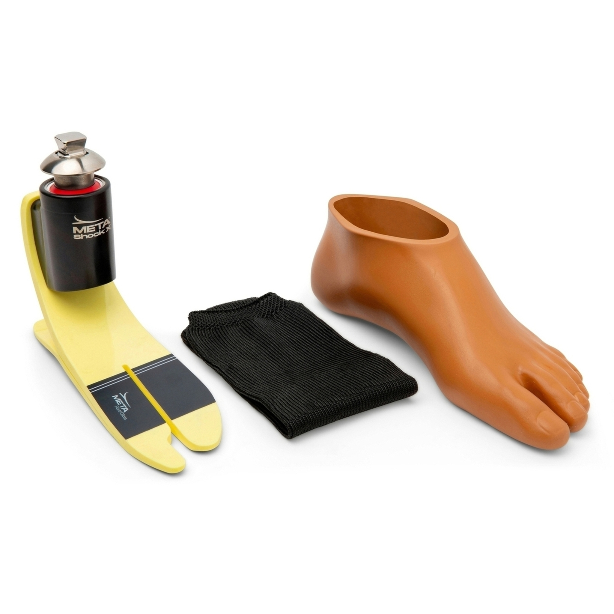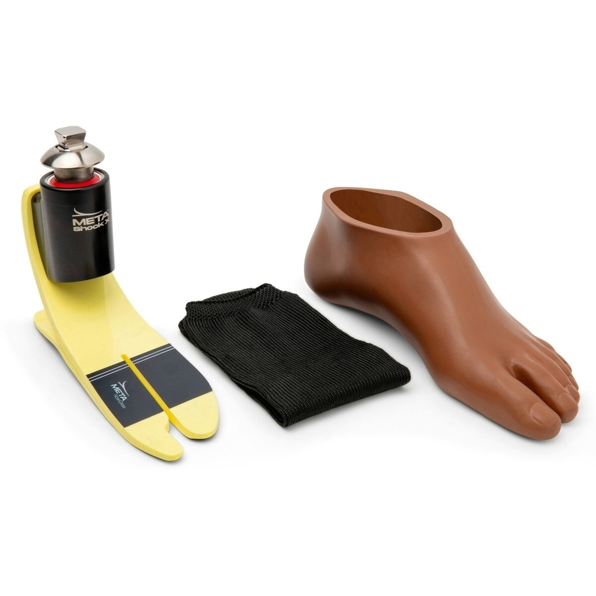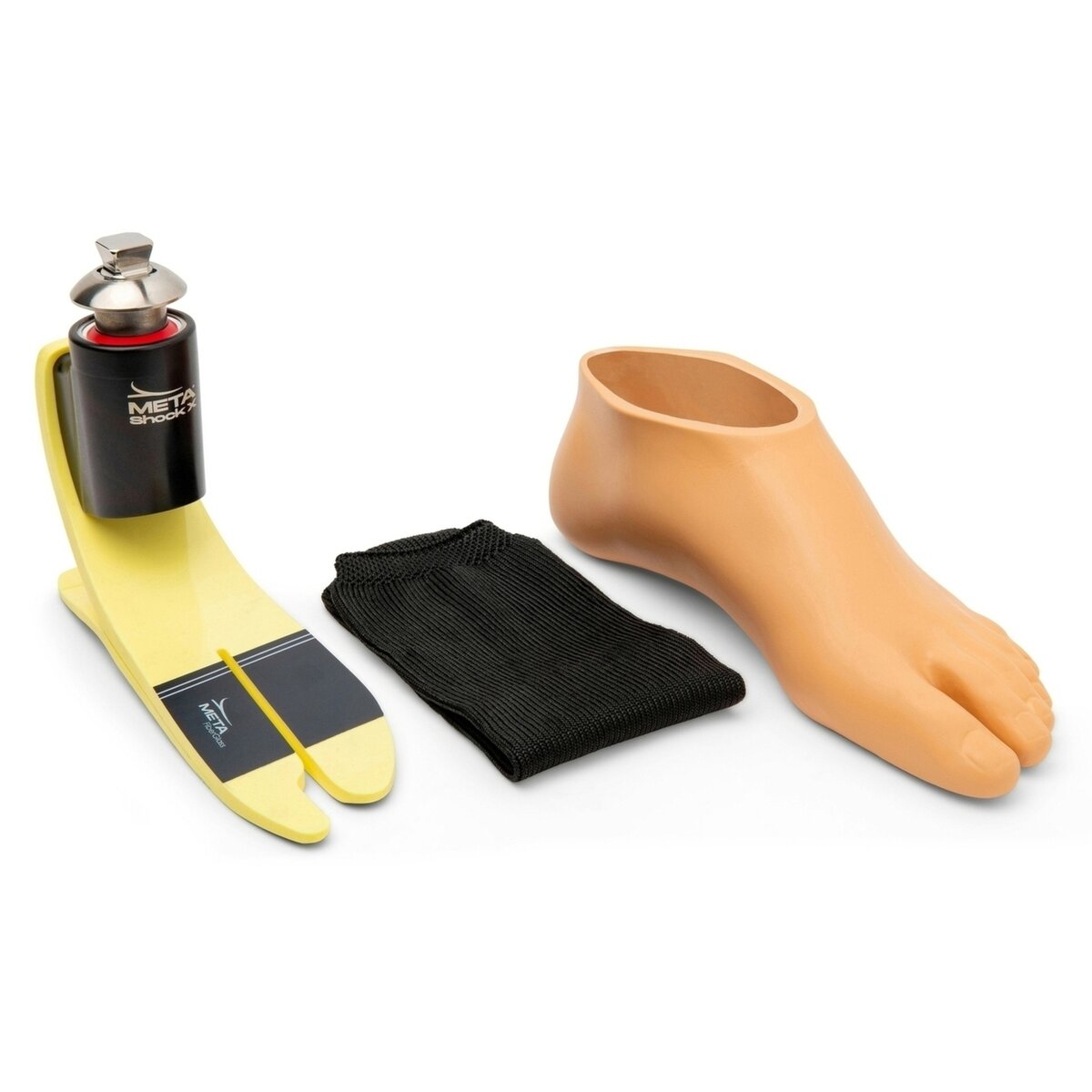 The FiberGlass META Shock® X features a META-Unibody® platform, split keel design for stability and ground compliance, high energy return, and a durable fiberglass construction, providing flexible and comfortable performance for K3/K4 prosthetic users up to 365 pounds on various terrains.