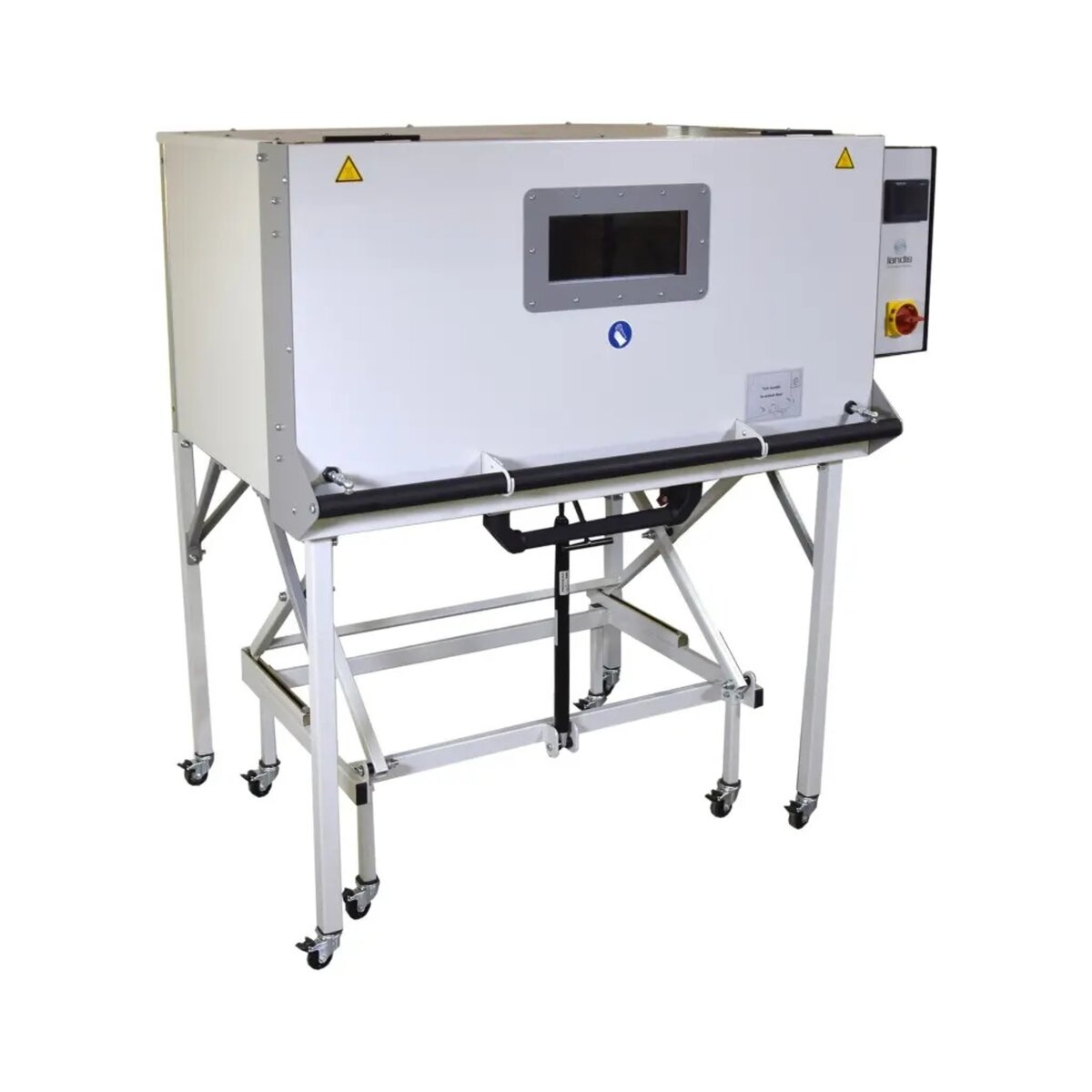 The Infrared Oven IR1003 is an ideal basic model for heating sheets of material, featuring a touchscreen control panel, optical temperature sensor, timer, and ramp function for slow heating (Pre-Preg processing). It includes a roll-about tray with Teflon membrane measuring 36 ¼’’ x 28 ¼’’ (92 x 72 cm), which is height-adjustable for Blister-Forming Trays. The oven allows users to store up to four temperature settings and displays both preset and actual temperatures on a clear two-line display. A space-saving sliding door and signal light for temperature alerts enhance both convenience and efficiency.