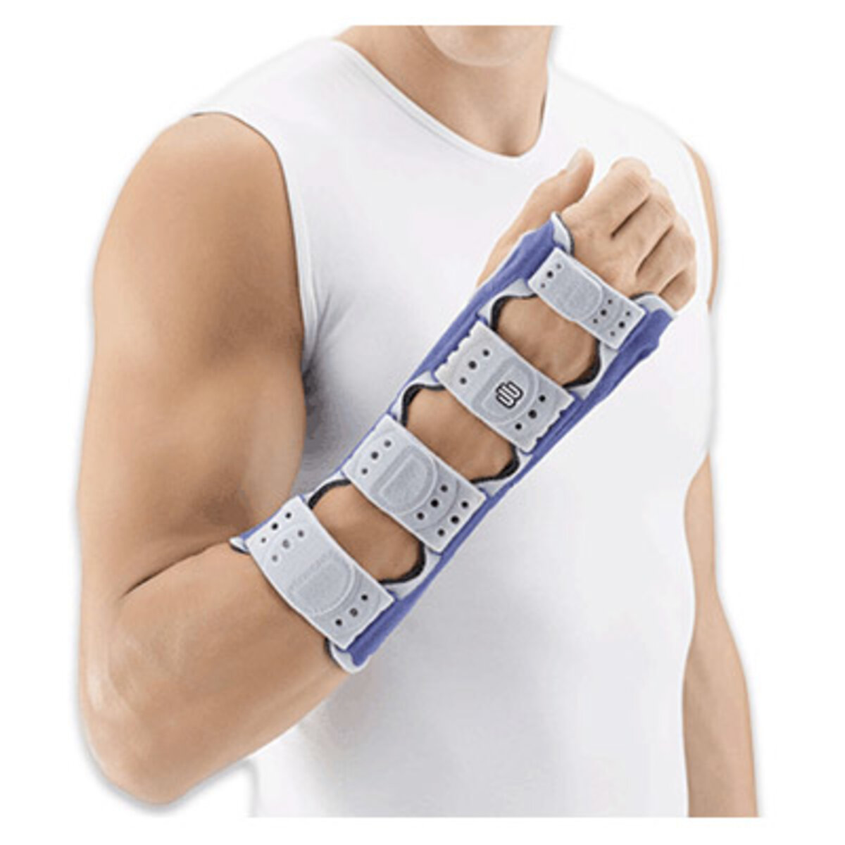 The ManuLoc® is a stabilizing support. Breathable materials and quality workmanship (no seams) ensure maximum comfort. Large Velcro fastenings facilitate fitting and removal of the stabilizing support. Integrated, anatomically contoured aluminum bars can be adjusted. Titanium in color.
