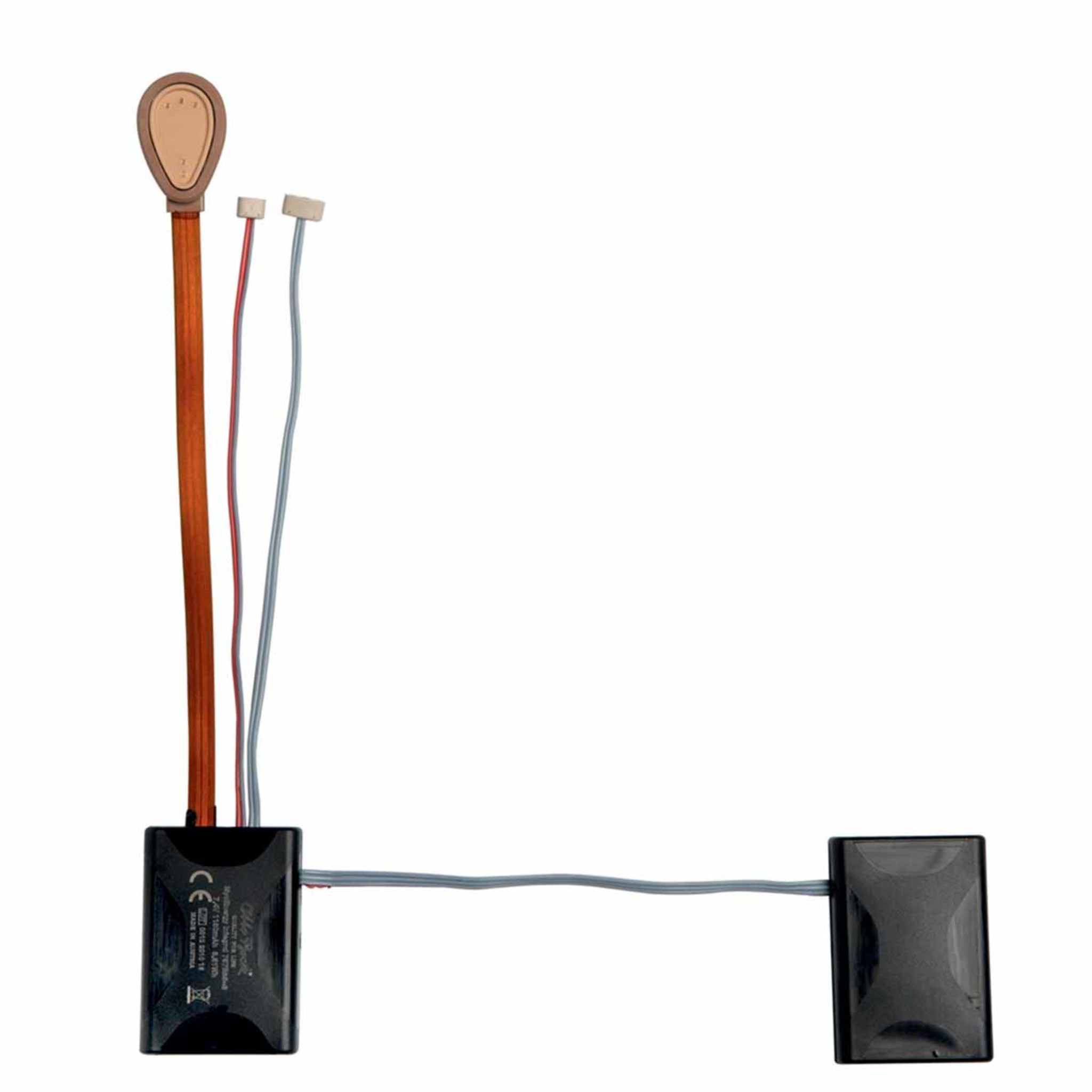 The MyoEnergy Integral 757B35=* is an integrated power supply system made up of several components. The charging receptacle enables battery contact, indicates the current charge status and serves to switch the prosthesis on and off and release it in an emergency. The communication cable with a 3-pin receptacle is used for the exchange of data. The supply cable establishes the connection between the battery and the respective prosthesis component. The battery consists of two cells with different capacities.