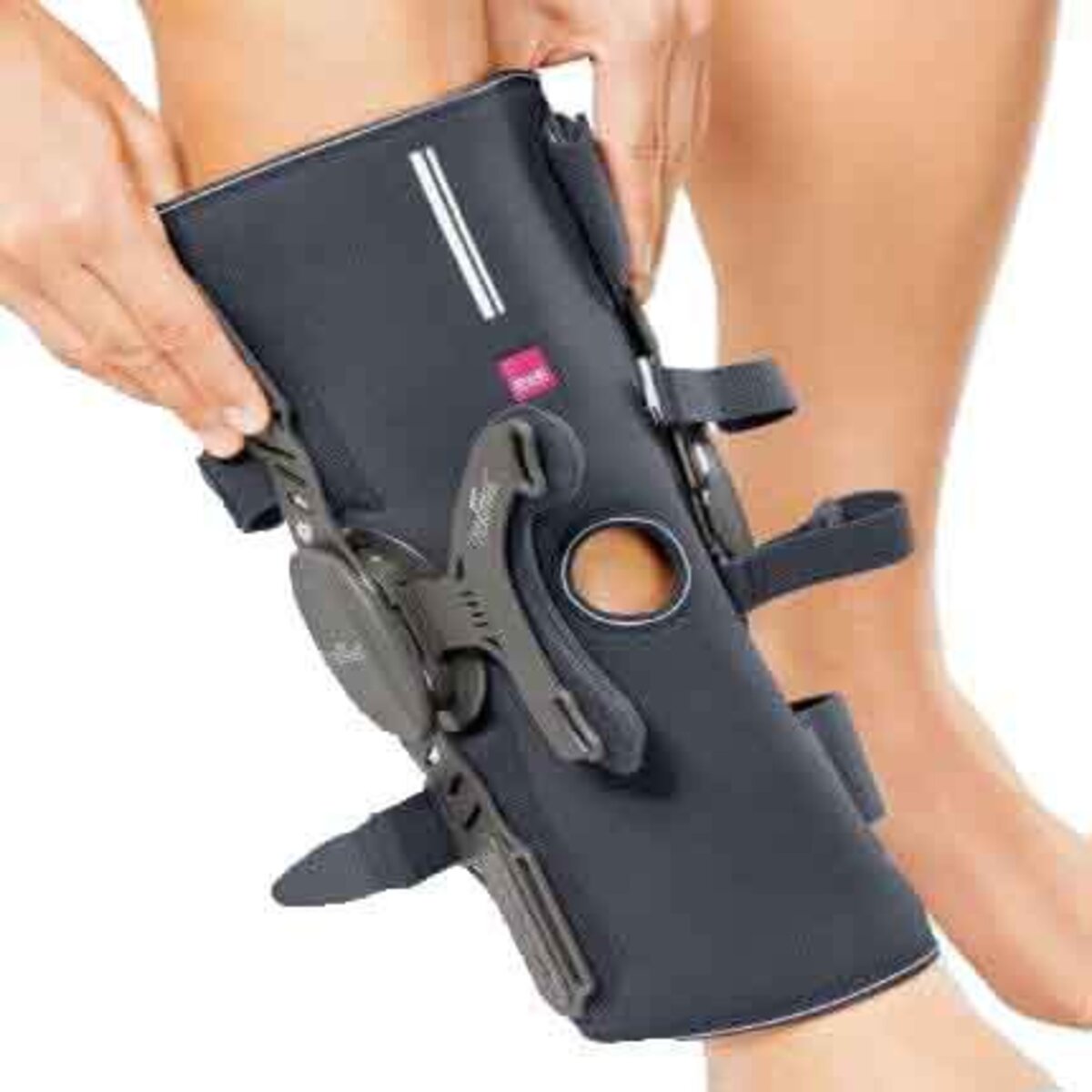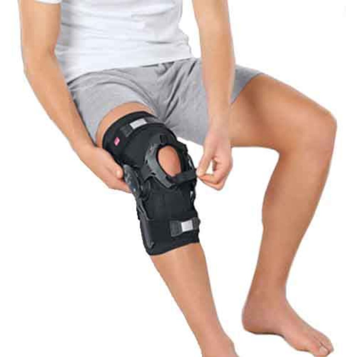 The PT® Control II uses polycentric physio-glide hinges based on the principle of 4-chain linkage to prevent hyperextension and limit range of motion. It uses an adjustable patella lateral stabilization buttress and air cushion unit for tracking and correction of the patella glide. It is designed for a modern look and proprioceptive effect.