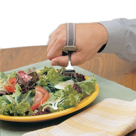 The leather ADL cuff with elastic strap. Cuff holds various utensils as well as the right-angle pocket. Sizes are based on MCP width. Utensils are not included.