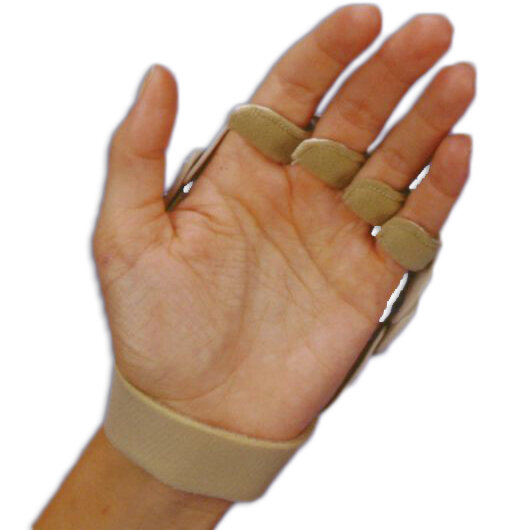 For mild to moderate ulnar drift corrections, the Polycentric Hinged Ulnar Deviation Splint comes with malleable aluminum finger pieces to provide palmar surface support. For user comfort, the finger pieces are covered with a foam-lined material that is washable. The part that is connected to the wrist is made of Kydex, a high temperature plastic. Using a heat gun, the plastic can be contoured for a custom fitting. The Small measures 2-3/4" – 3" from the 2nd to 5th MCP width, Medium 3" – 3-3/8" and Large 3-3/8" – 3-5/8".