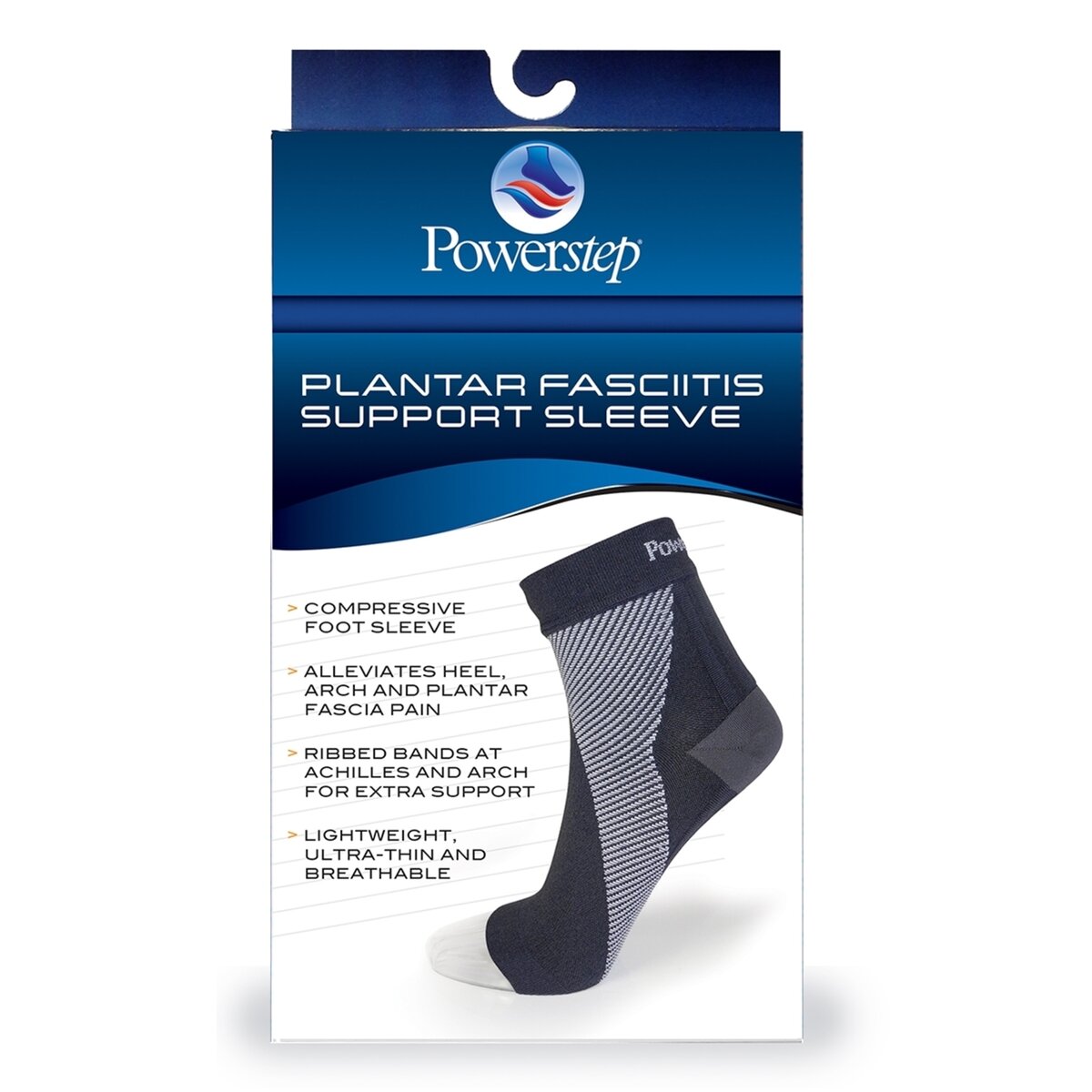 The PowerStep Plantar Fasciitis Foot Sleeve features 20-30 mm Hg compression that lifts and stretches the arch to alleviate plantar fasciitis pain. Measure foot around arch.