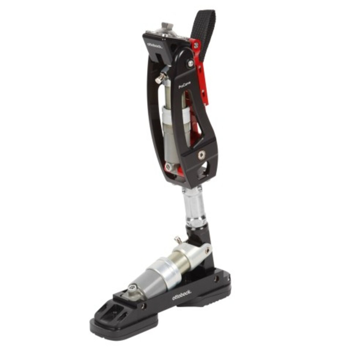 The ProCarve knee joint features hydraulic damping elements and a disengagement function to make sitting down more comfortably. Individually adjustable air pressure controls the flexion movement and the hydraulics dampen the extension movement. To sit down, the patient can bend the knee joint without damping simply by pulling on the attached belt.
