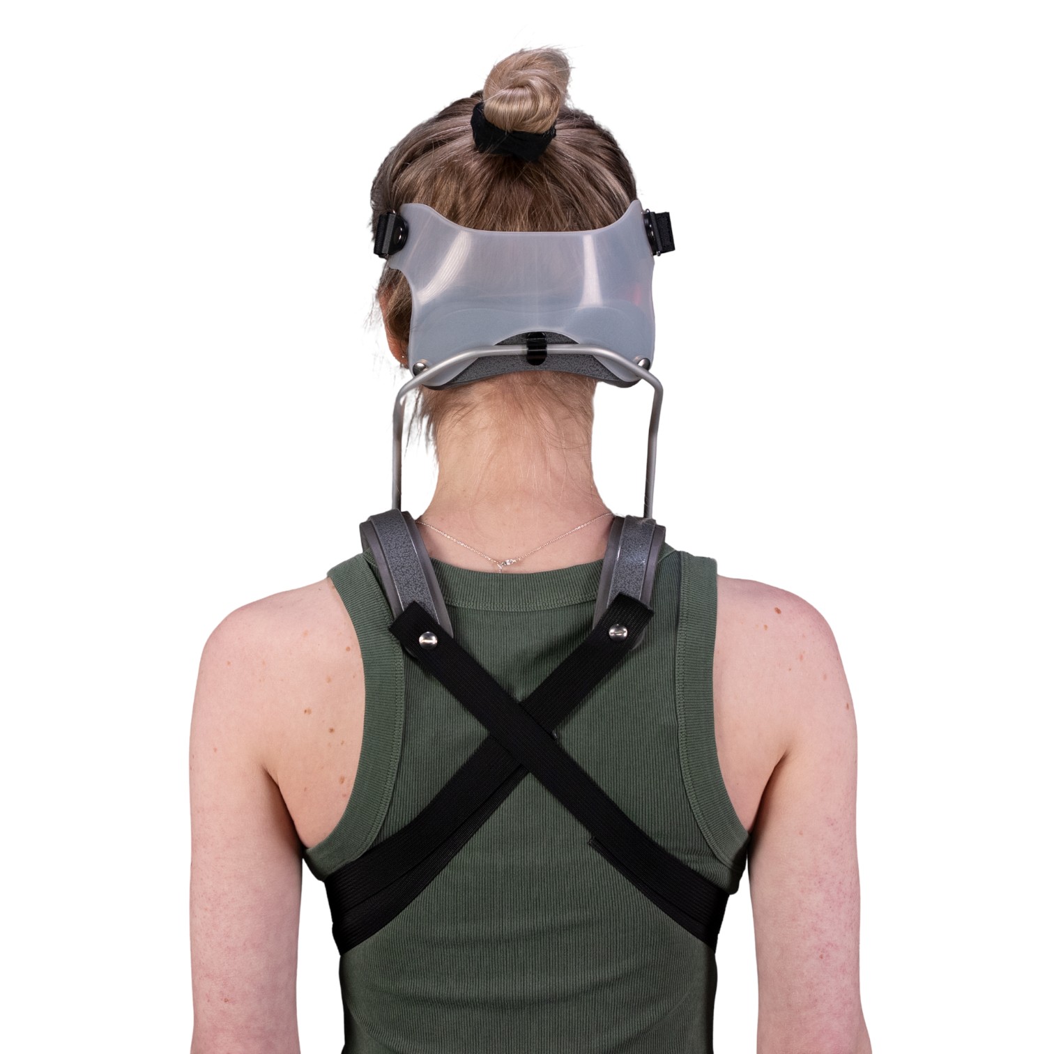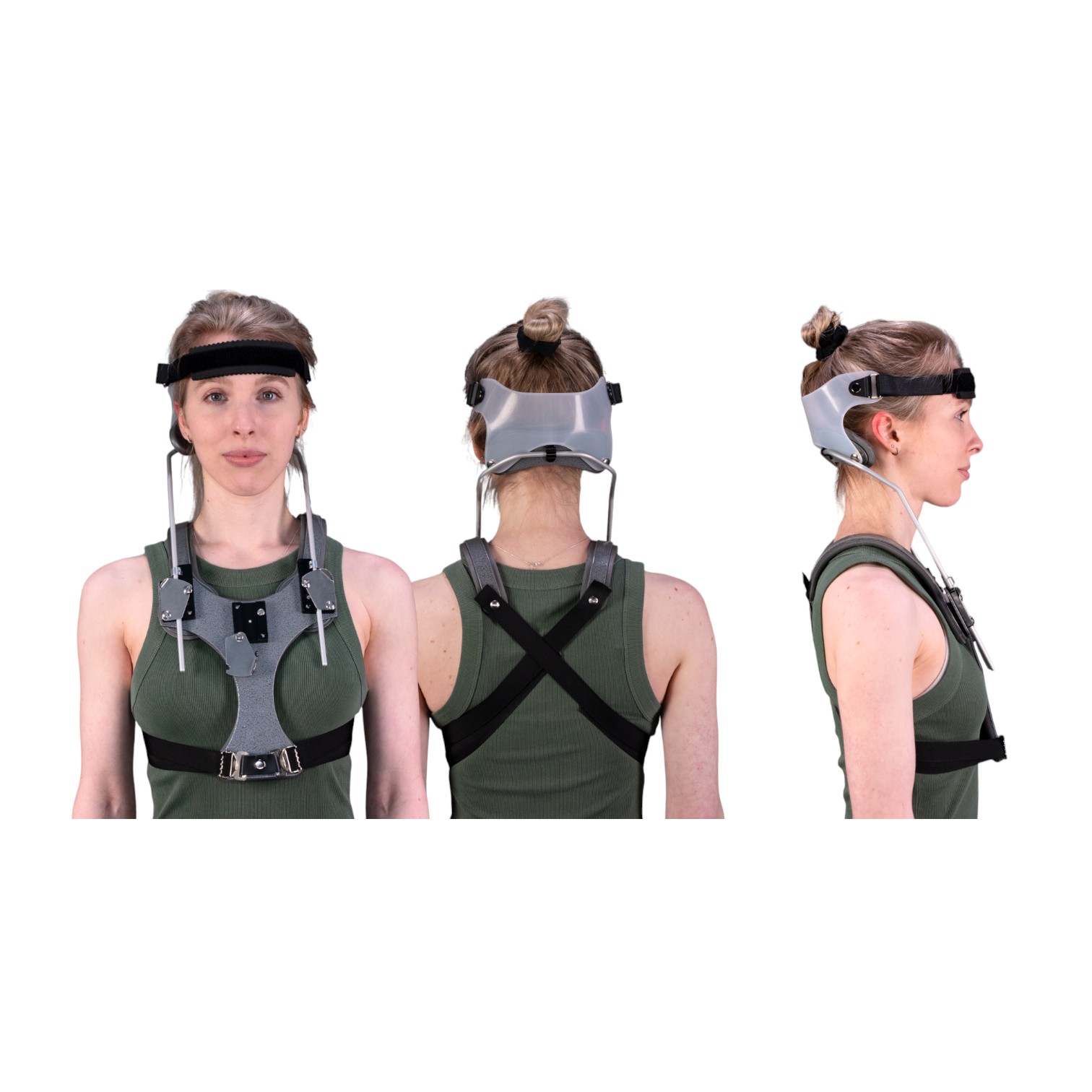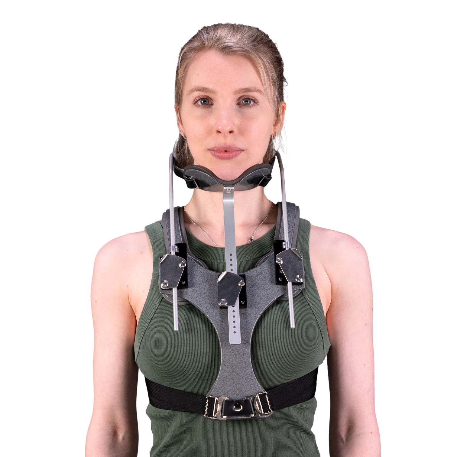 - Sternal Occipital Mandibular Immobilizer with adjustability to immobilize head in prescribed position.