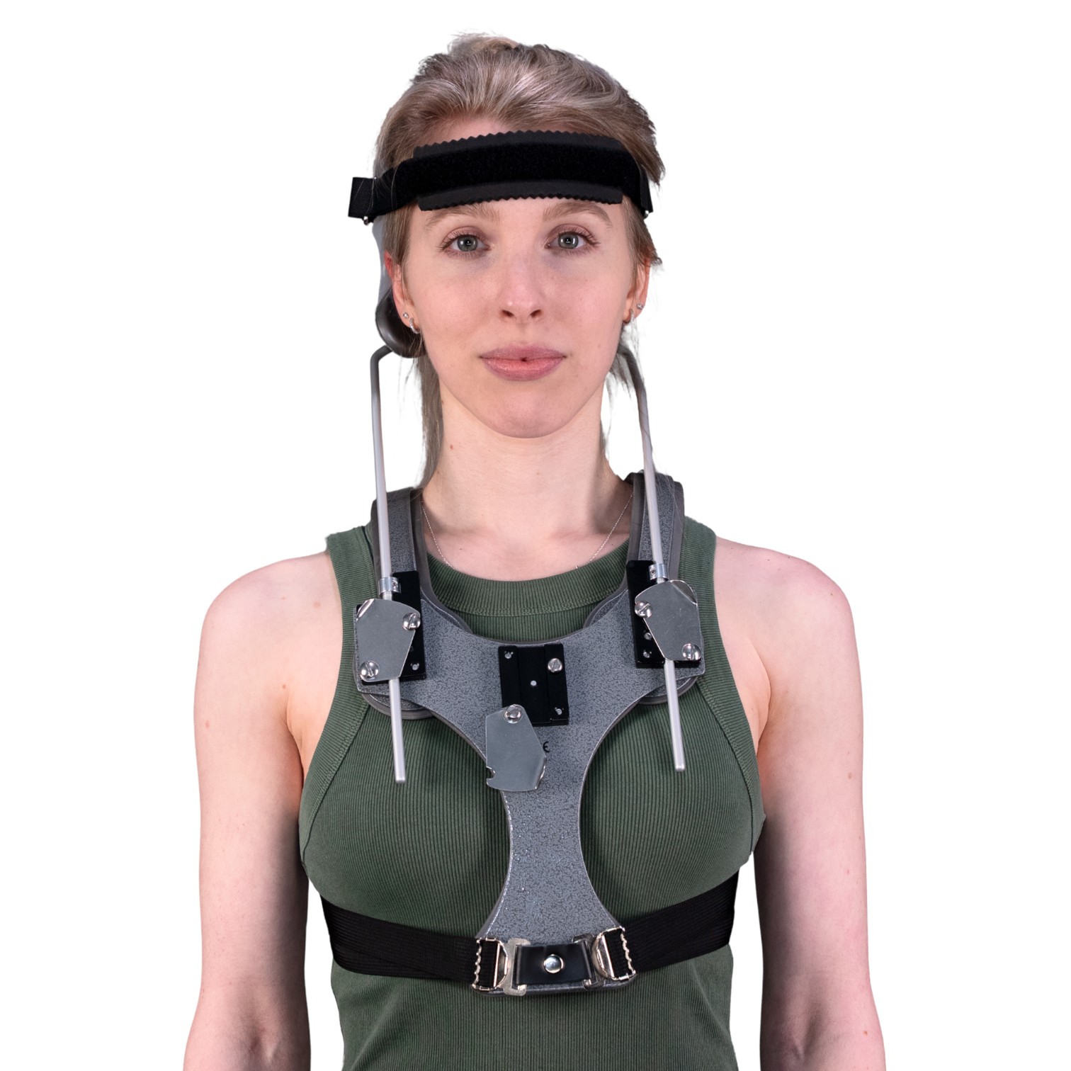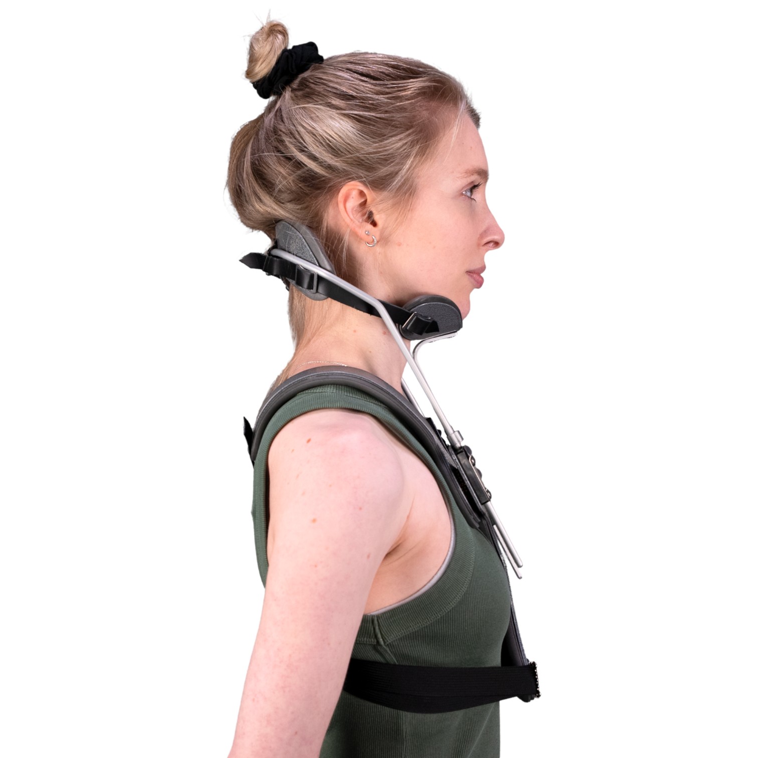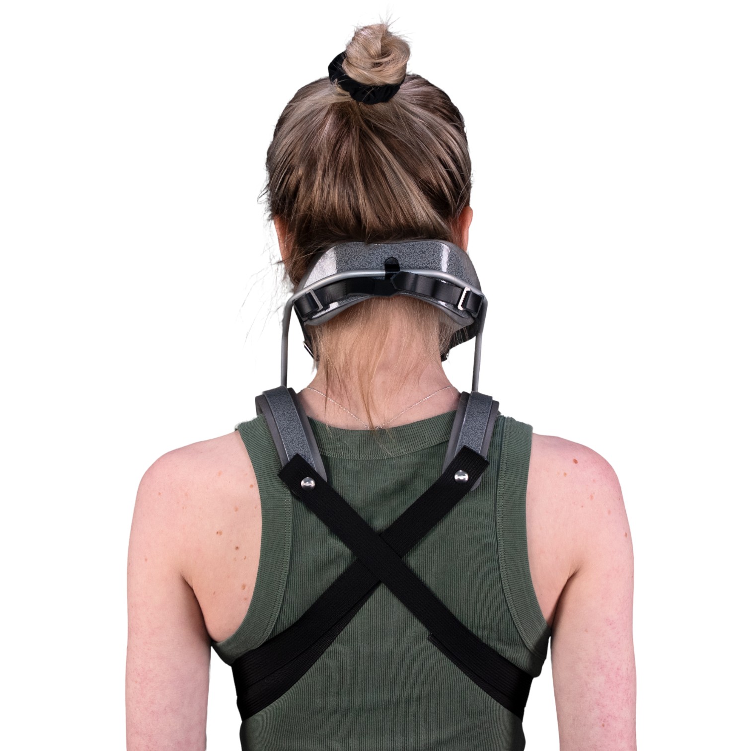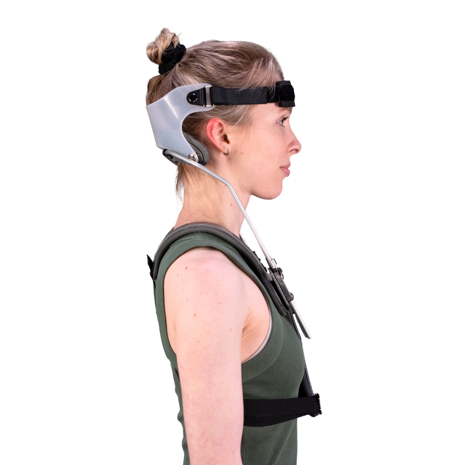 - Sternal Occipital Mandibular Immobilizer with adjustability to immobilize head in prescribed position.