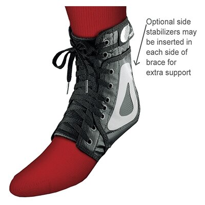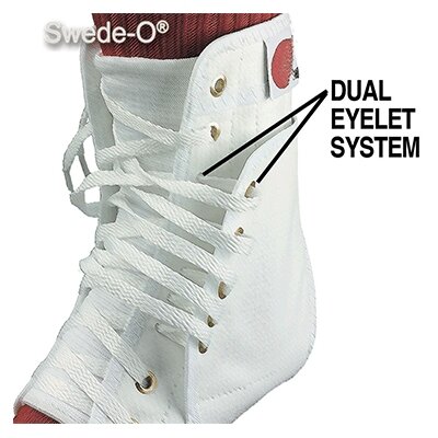 The original “Swede-O”. Exclusive lacing system keeps the brace tighter, longer than any other brace for long-lasting support. The lacing system features two sets of eyelets in the midsection of the brace. The dual eyelets create a “pulley” effect to give you greater leverage so you can lace the brace tighter for a more effective “Ankle Lok”. The dual eyelets are offset to trap the tightened laces between the inner and outer eyelets, which keeps the laces tighter longer than competitor’s braces.