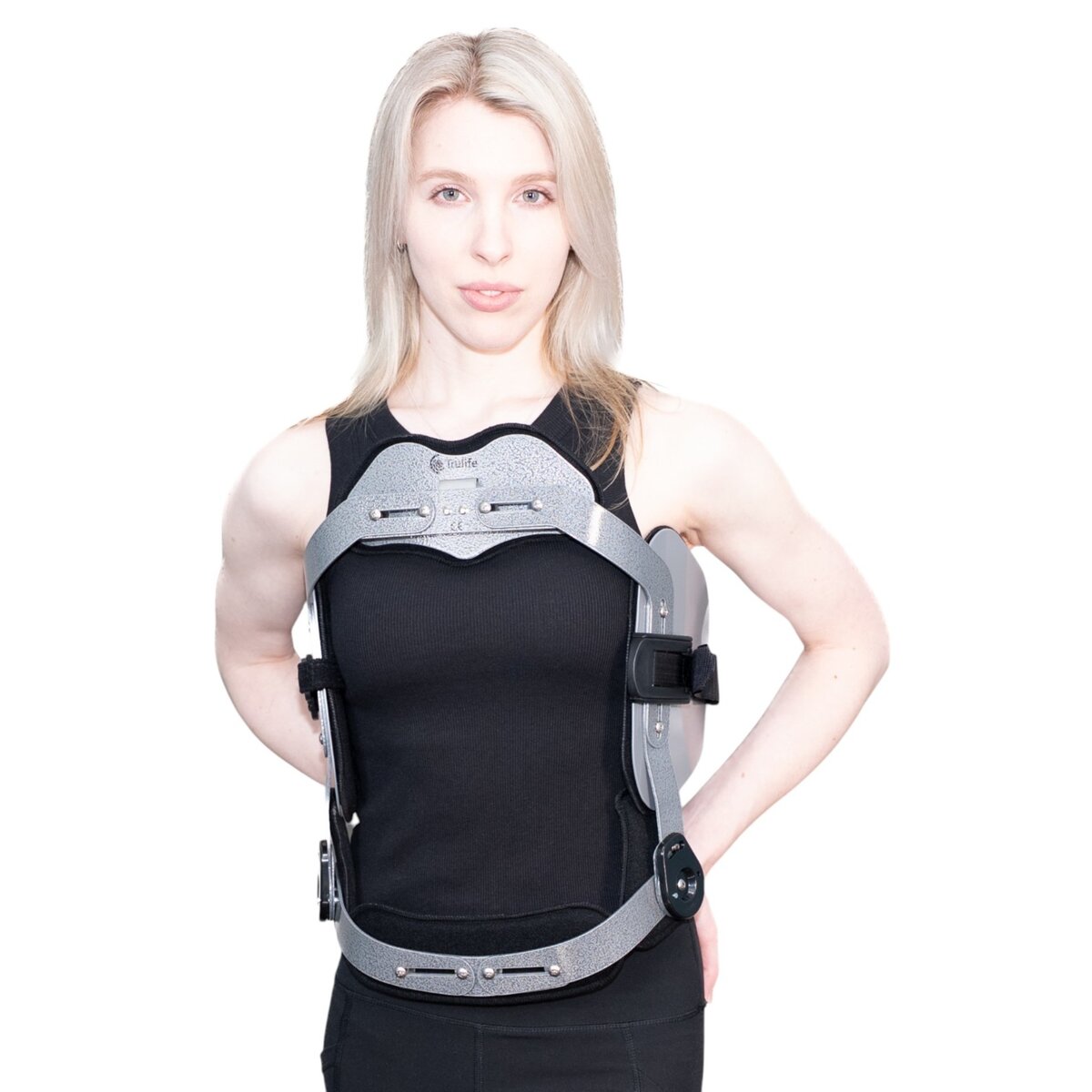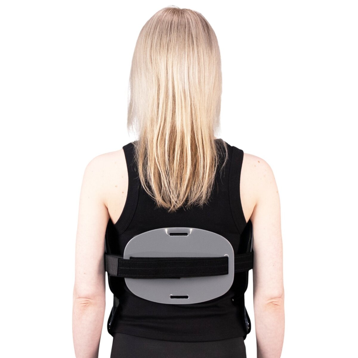 The T39 Hyperextension Orthosis limits anterior, posterior, and lateral movements. It features adjustable sternal, lateral, and pelvic padded plates for a better fit.