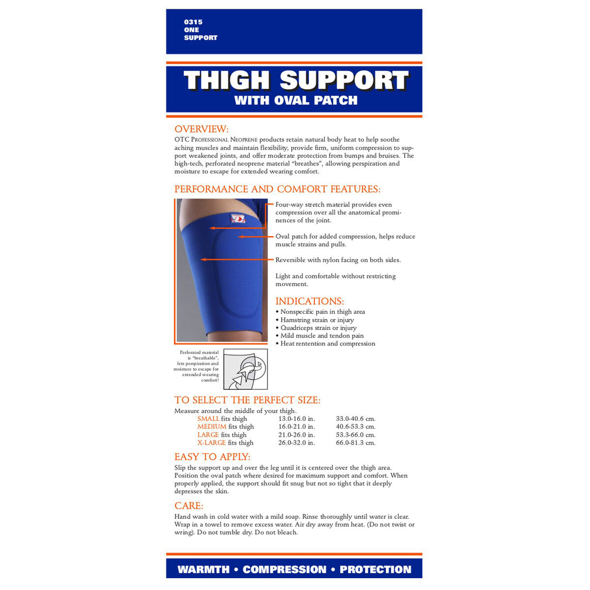The OTC 315 thigh support retains natural body heat to help soothe aching muscles and maintain flexibility, and provide firm, uniform compression to support weakened musculature. Handcrafted construction includes invisible stitching and heat seal seam tape for added comfort and durability. Effective support and value to keep you comfortably active. Excellent for use in athletic activities.