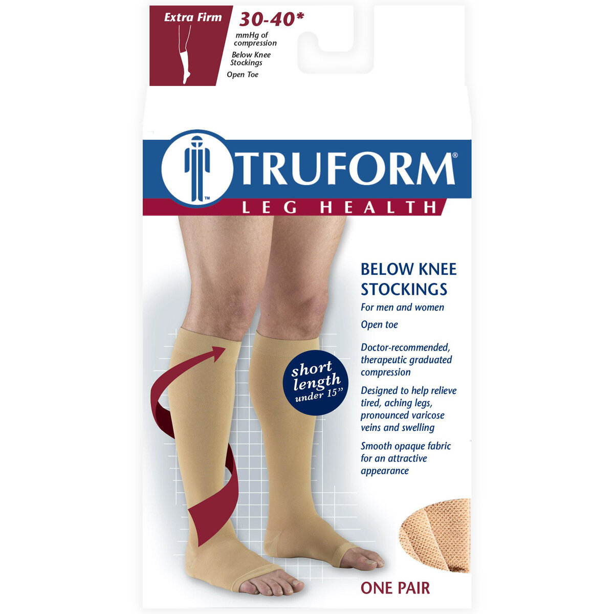 Designed to help relieve more pronounced conditions associated with poor circulation. Truform medical stockings feature a classic smooth knit texture fabric that helps conceal unsightly conditions. The open toe feature allows for easy toe inspection and permits one standard size to fit a variety of foot dimensions. Color options are basic neutrals for all-occasion wear. For men and women.