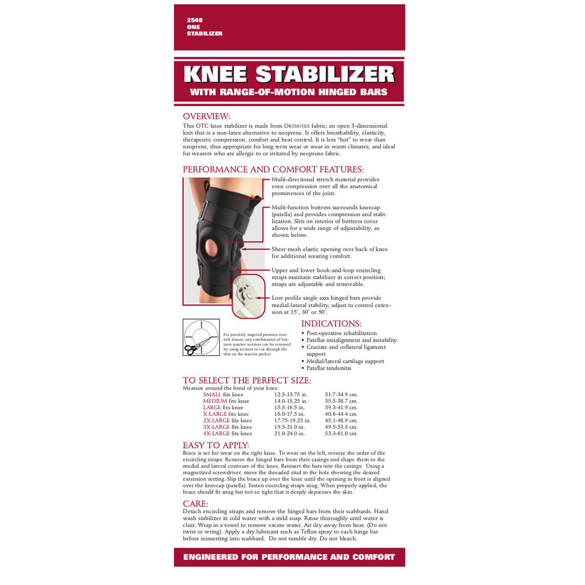 The OTC 2548 range-of-motion knee stabilizer offers exceptional service from knee surgery through post-op rehabilitation. It is made from Orthotex fabric, an open 3-dimensional knit that is a non-latex alternative to neoprene. It offers breathability, elasticity, therapeutic compression, comfort and heat control. It is less hot than neoprene, thus appropriate for long term wear or wear in warm climates, and ideal for wearers who are allergic to or irritated by neoprene fabric.