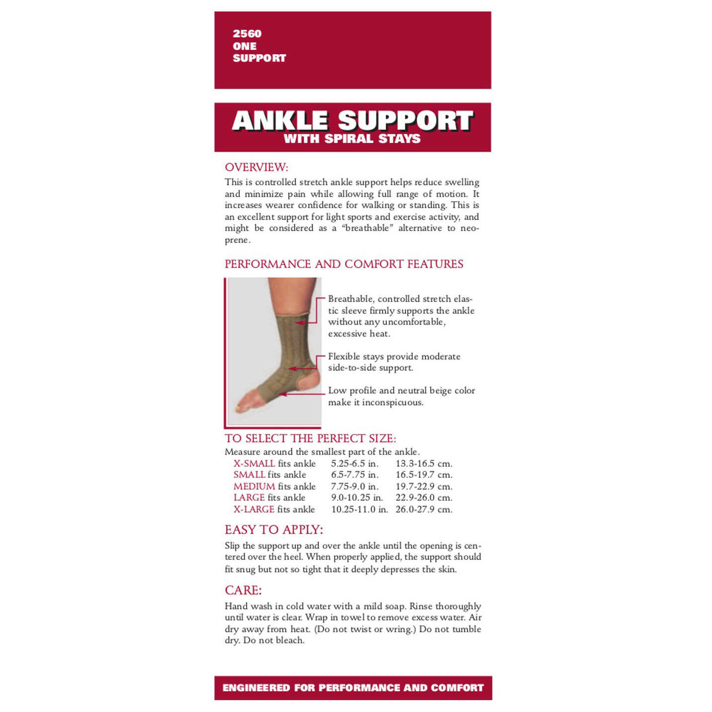 The OTC 2560 controlled stretch ankle support provides firm support to help reduce swelling and minimize pain while allowing full range of motion. It increases wearer confidence for walking or standing. This is an excellent support for light sports and exercise activity, and might be considered as a "breathable" alternative to neoprene.