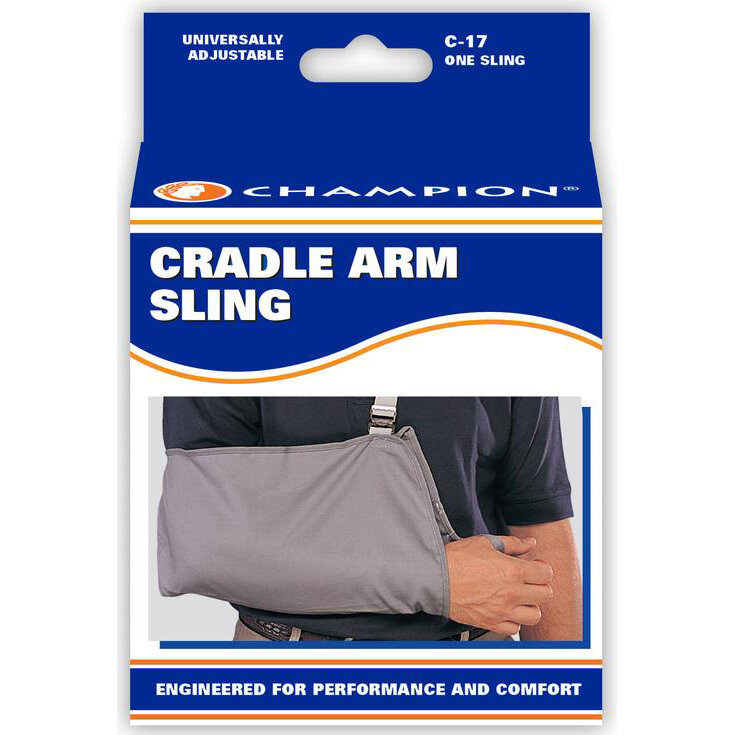 The Champion C-17 Cradle Arm Sling provides well-balanced support to the arm during recuperation from fracture, sprain or surgery, evenly distributing its weight. It is reversible for the right or left arm, and has a wide range of adjustment to easily fit most adults.