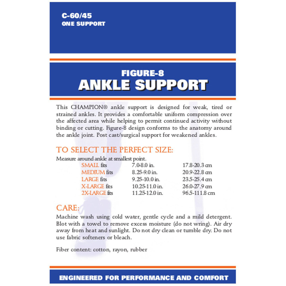 The Champion C-60/45 ankle support provides comfortable uniform compression over the affected area while helping to permit continued activity without binding or cutting. Absorbs perspiration for all-day wearing comfort.