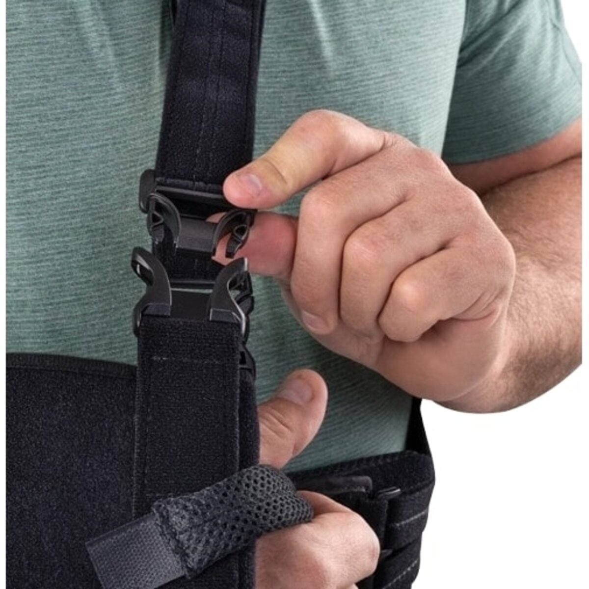 DonJoy®’s X-ACT Fit™ Shoulder brace is a functional, comfortable, and adaptable solution for postoperative or post-traumatic recovery. The customizable immobilization system can easily be don and doffed, while its lightweight mesh material and padded armrest provide cushioned support and airflow. With an optional three-point off-loading shoulder ring that allows for an even distribution of weight across the uninjured shoulder, the patient can experience less stress on their neck.