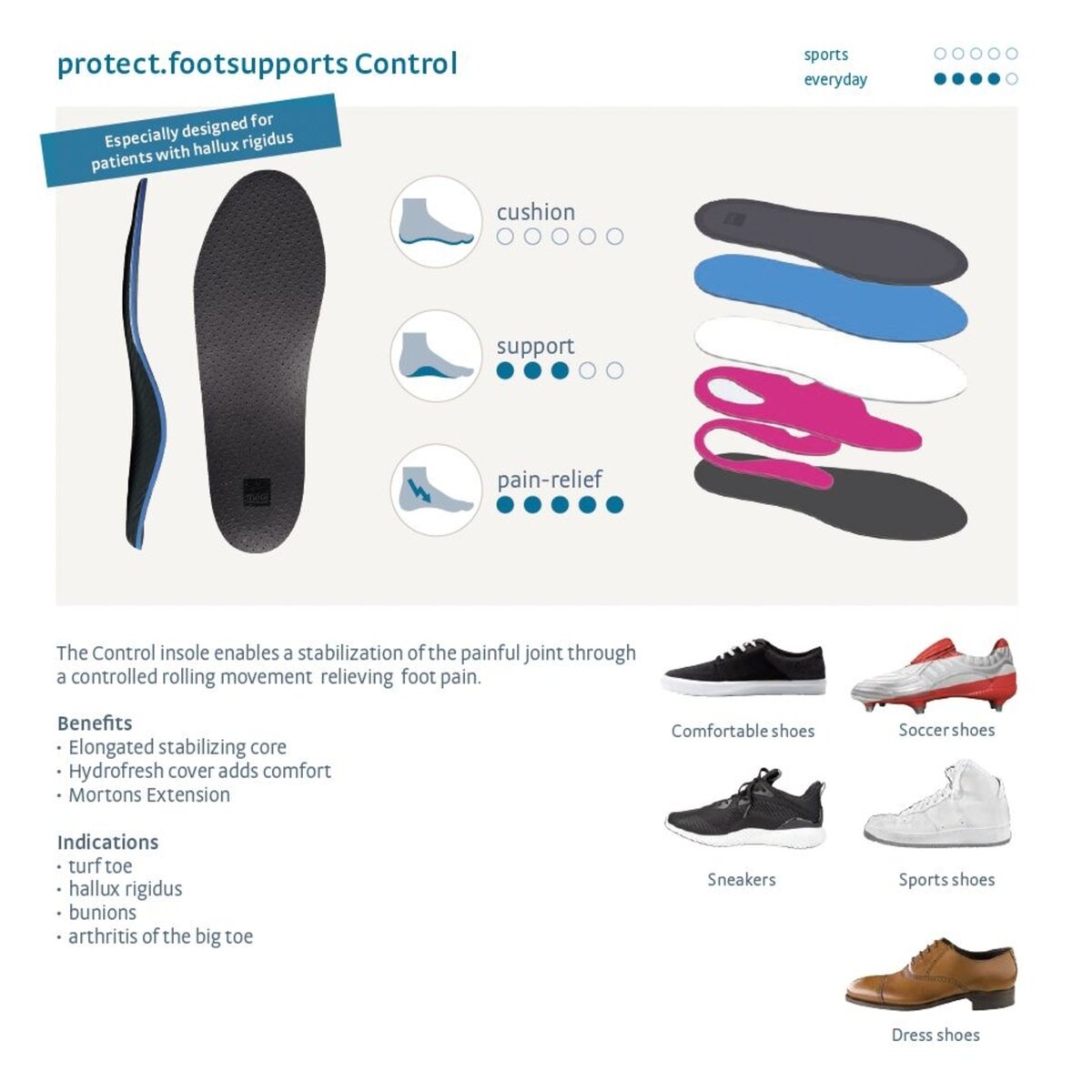 The doc ortho control features a targeted reinforcement under the big toe eases stress on the joints that cause pain and discomfort.
